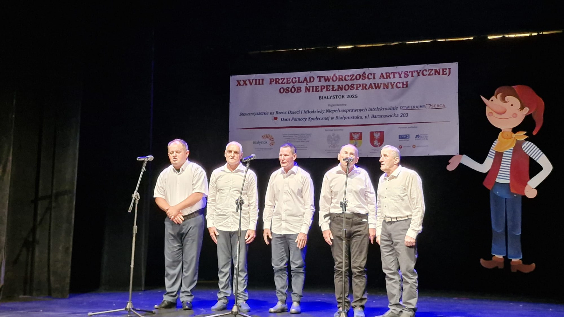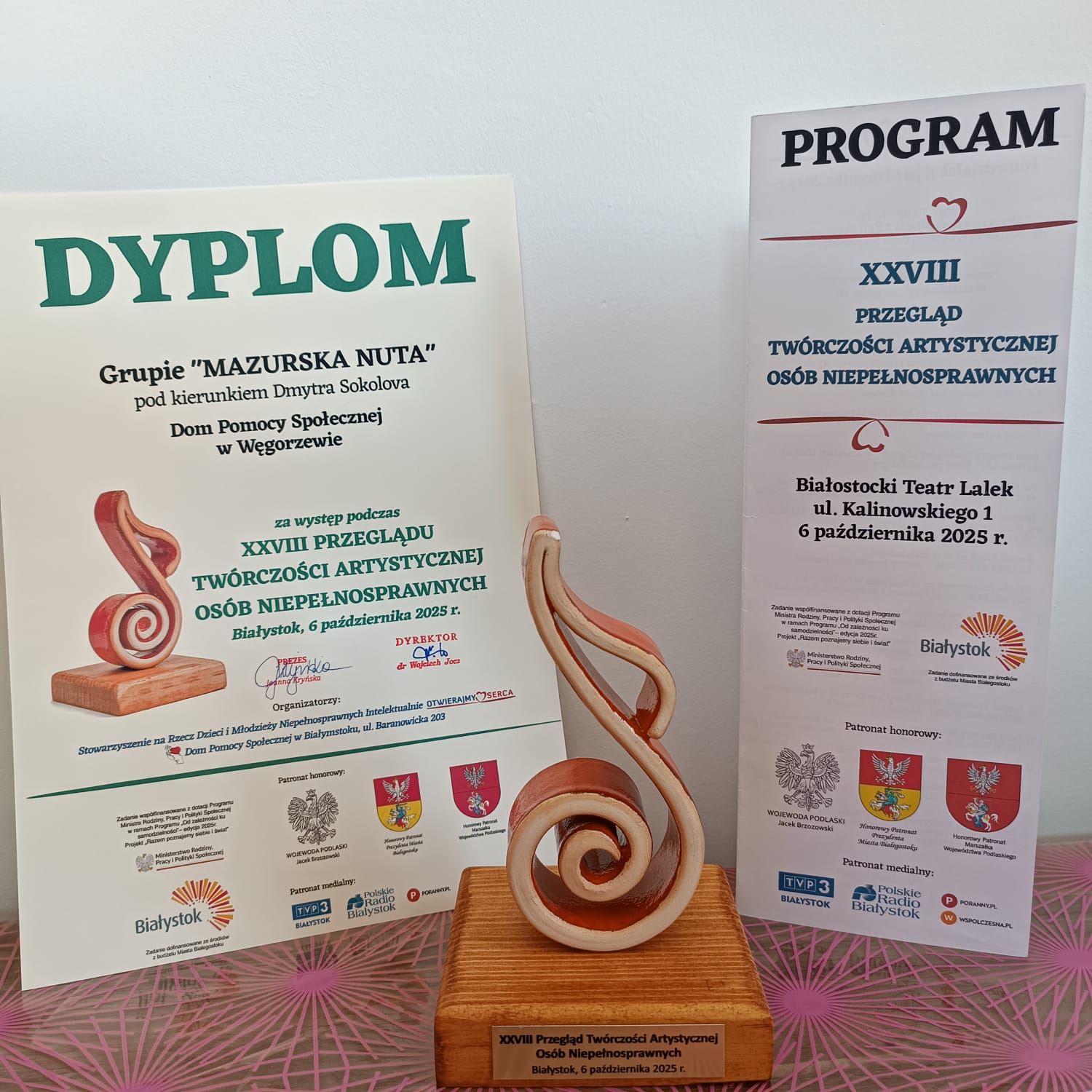 W dniu 6 października 2025 r. grupa wokalna „Mazurska Nuta” działająca w Domu Pomocy Społecznej w Węgorzewie wzięła udział w XXVIII Przeglądzie Twórczości Artystycznej Osób Niepełnosprawnych, który odbył się w Białostockim Teatrze Lalek.