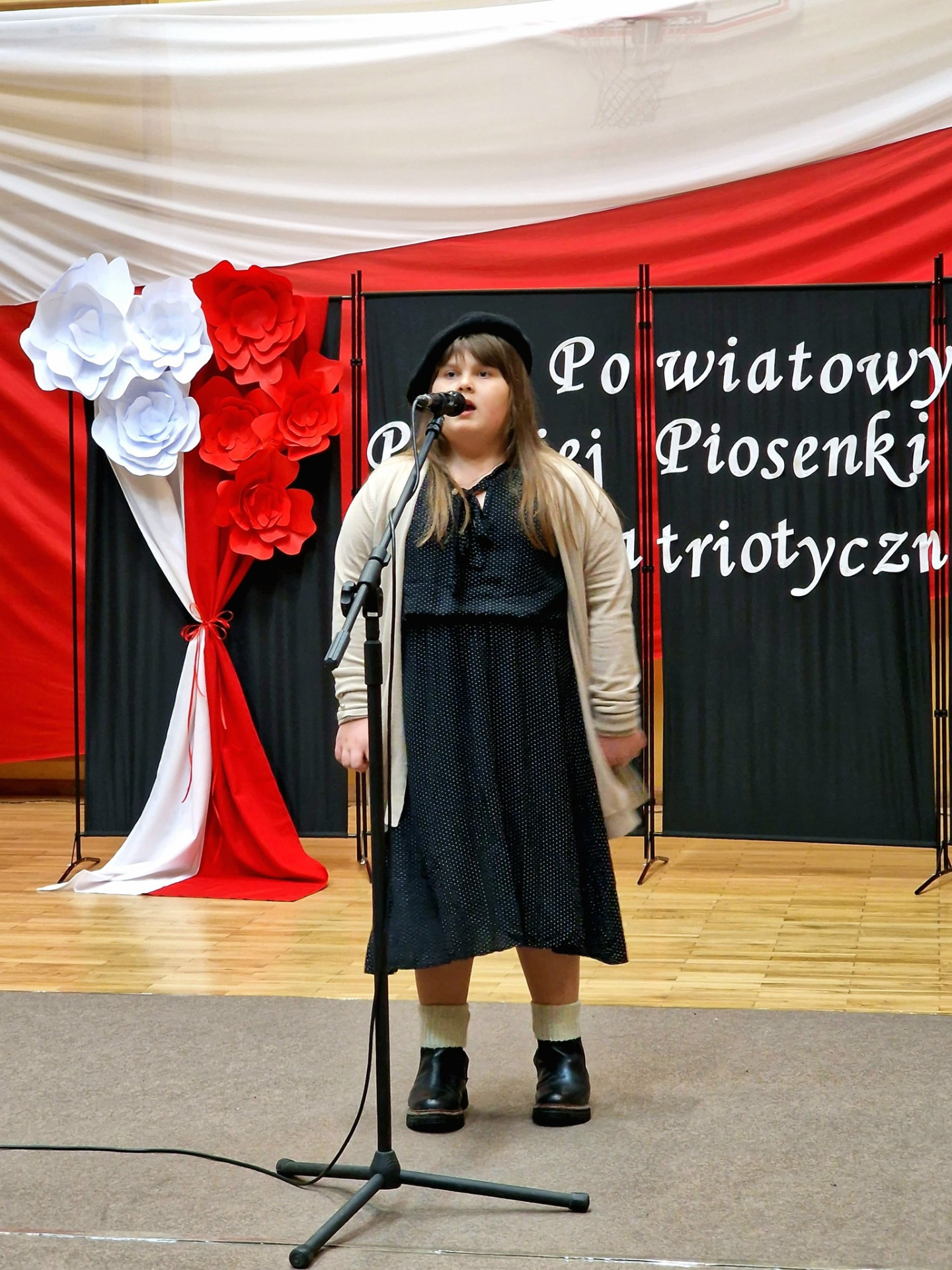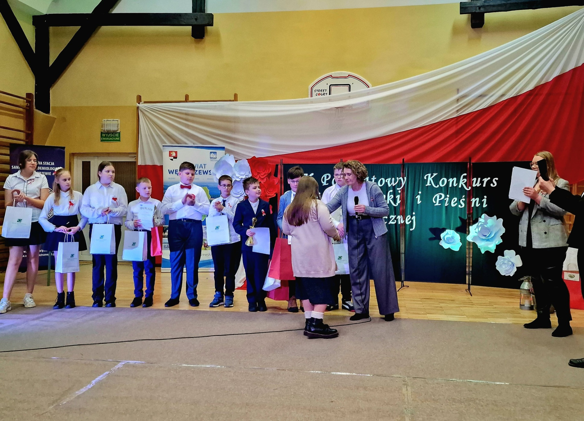 Prowadzący nasz konkurs Andrzej Urbanowicz oraz Julia Waraksa (przewodnicząca SU naszej szkoły) z ogromnym wzruszeniem powitali przybyłych gości. Podkreślili, że nasz konkurs to wyjątkowe wydarzenie, podczas którego wspólnie oddajemy hołd naszej Ojczyźnie – śpiewem, który od wieków jednoczy serca Polaków i przypomina o tym, co w nas najpiękniejsze: miłości do kraju, tradycji i wolności. W wydarzeniu wzięli udział uczniowie Szkół Podstawowych z Powiatu Węgorzewskiego. Konkurs cieszył się dużym zainteresowaniem, a poziom występów był bardzo wysoki. Jury miało niezwykle trudne zadanie i długo obradowało, zanim ogłosiło wyniki. Publiczność oraz uczestnicy cierpliwie oczekiwali na rozstrzygnięcie. W przerwie, podczas obrad Jury konkursowi towarzyszyła akcja promocyjno – profilaktyczna , którą przeprowadziła Pani Dorota Kozian – pracownik Powiatowej Stacji Sanitarno-Epidemiologicznej w Węgorzewie. Celem jej było propagowanie zdrowego stylu życia wśród dzieci, młodzieży oraz dorosłych, uświadamianie zagrożeń związanych z używaniem alkoholu i innych substancji psychoaktywnych oraz wzmacnianie postaw prospołecznych. Przy stoisku Pani Doroty przybyli goście mogli wziąć udział między innymi w konkursie wiedzy na temat używek, założyć alkooogle i spróbować rzutu do celu.