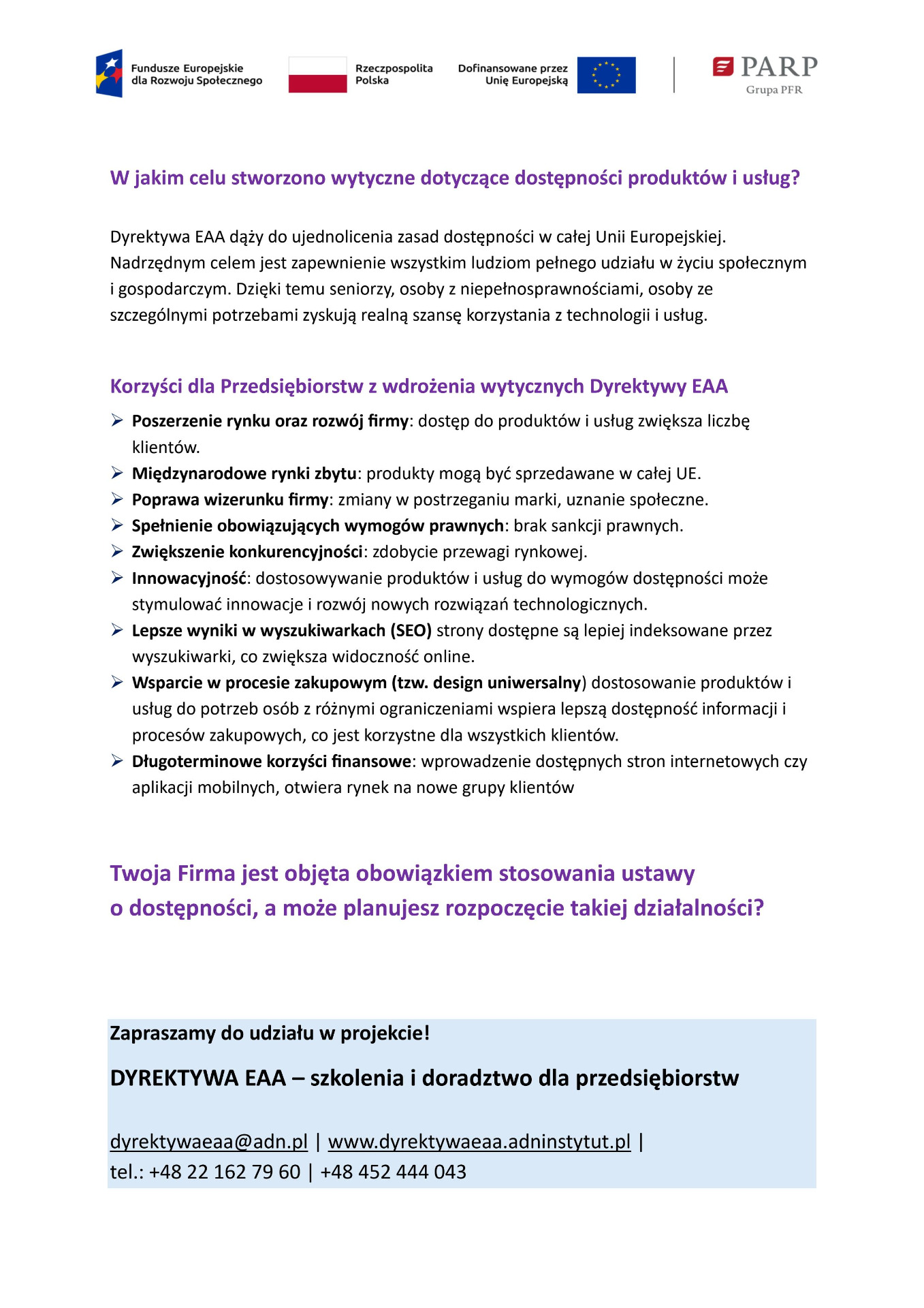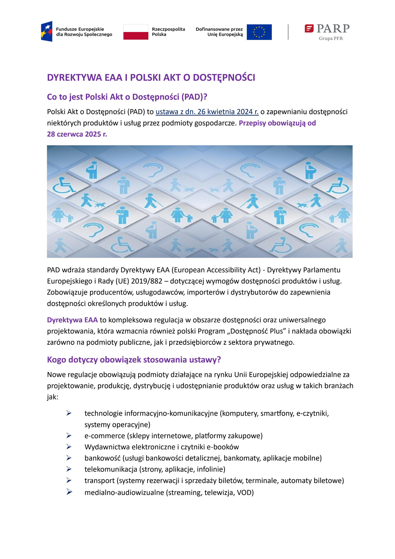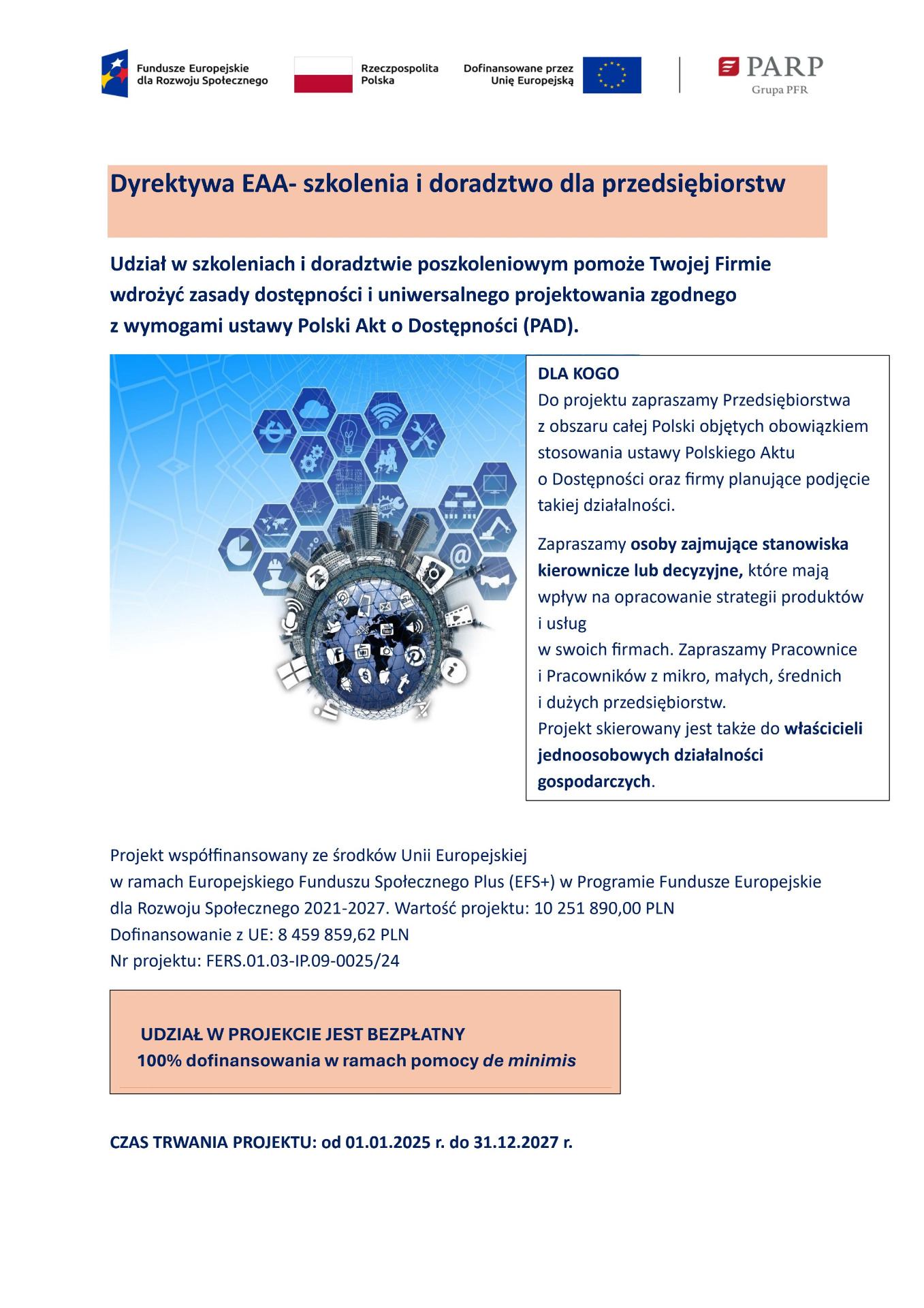 Projekt skierowany jest do firm objętych wymaganiami Polskiego Aktu o Dostępności (PAD) oraz tych, które planują działania gospodarcze wymagające zgodności z ustawą i Dyrektywą EAA. To nowe obowiązki, ale również nowe możliwości dla przedsiębiorstw!